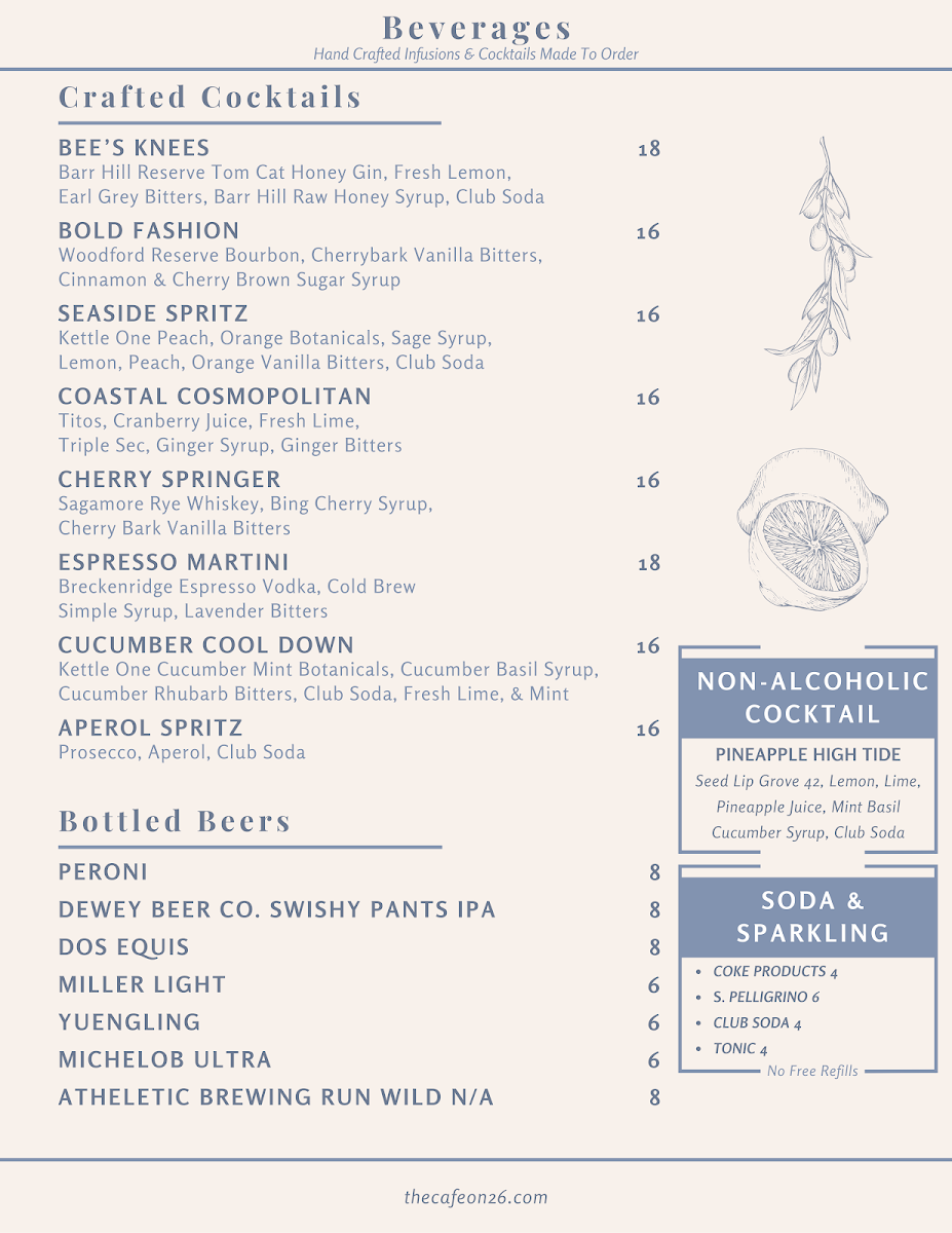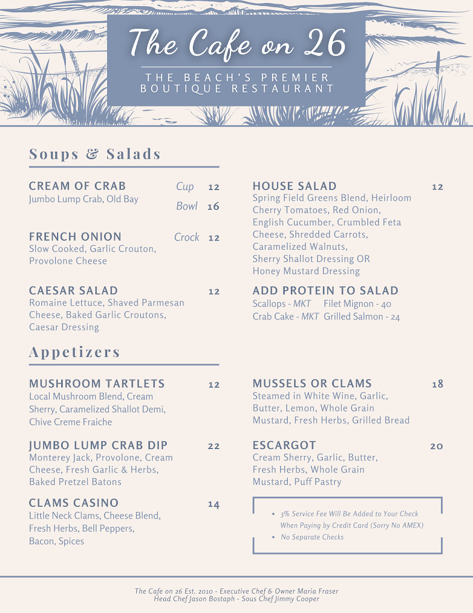 Located in the picturesque Ocean View, Delaware, The Cafe on 26 brings a delightful farm-to-fork experience with breathtaking ocean views. Renowned for its world-class chefs, the bistro offers a menu that captivates the senses.